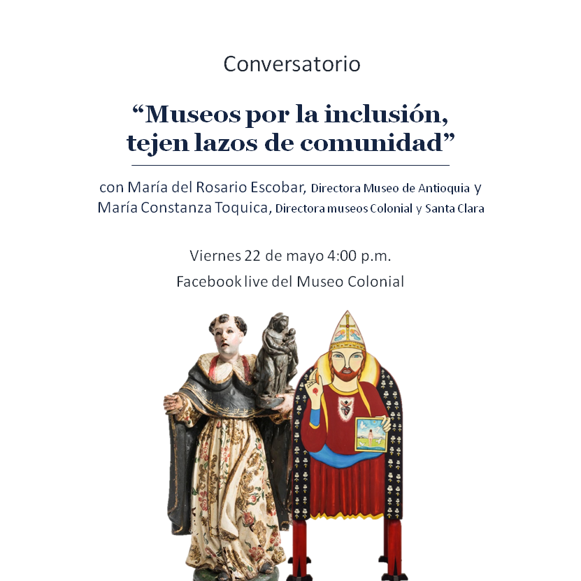 En este conversatorio, María del Rosario Escobar, directora del Museo de Antioquia, y María Constanza Toquica Clavijo, directora de los museos Colonial y Santa Clara de Bogotá, hablarán sobre cómo desde todas las áreas de trabajo de estos tres espacios museales se trabaja en la integración de los diferentes públicos y, muy especialmente, de las comunidades del entorno. Los museos Colonial y Santa Clara han estrechado lazos con las comunidades vecinas del centro histórico a través de diferentes iniciativas culturales y educativas. Asimismo, el Museo de Antioquia ha incorporado en su narrativa curatorial y en sus prácticas a diversidad de actores sociales que habitan el centro de la ciudad de Medellín.